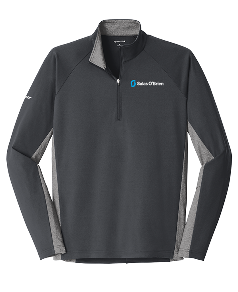 By mixing heather with a solid color and adding reflective hits this moisture-wicking pullover has a technical look plus plenty of stretch for easy movement.